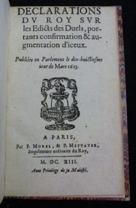 [DUELS]. Déclarations du Roy sur les édicts des duels, portant confirmation & augmentation d'iceux. Publiées en Parlement le dix-huictiesme jour de Mars 1613. Paris, F. Morel & P. Mettayer, 1613. Petit in-8 de 23 pp., bradel demi-percaline ocre...