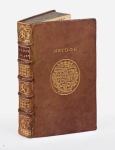Seconde édition de ce rare recueil de nouvelles galantes. # Publié par Saint-Hyacinthe, selon Jules Gay, l'ouvrage comprend vingt-neuf historiettes – telles La Maladie d'amour, Le Rival cocher, Les Bas verts, La Veuve par hasard, L'Excocu, La Femme amante et rival de son mari, L'Amour fouetté, etc. – ainsi qu'un catalogue de l'éditeur de 14 pp. La première édition du recueil avait paru à La Haye, chez Alexandre de Rogissart, en 1718. # Reliure aux armes et pièces d'armes de la comtesse de Verrue, l'une des plus grandes bibliophiles de son temps, provenant de sa bibliothèque de campagne à Meudon, avec la mention Meudon dorée sur les plats et inscrite à la plume sur le titre du volume. # Jeanne-Baptiste d’Albert de Luynes (1670-1736), comtesse de Verrue, « aimait passionnément les lettres et les arts ; elle collectionnait tout ce qui était beau ; sa bibliothèque qui contenait en majorité des romans et des pièces de théâtre, comptait 18 000 volumes de choix, reliés pour la plupart par les meilleurs artistes de l’époque. » (Olivier, pl. 799). Son goût pour les contes et les romans galants, voire licencieux, valut à sa bibliothèque d’être censurée. Ces Historiettes galantes ne figurent pas dans le catalogue de sa vente de 1737. # De la bibliothèque Philippe-Louis de Bordes de Fortage (1925, n°3203), illustre collectionneur bordelais, avec ex-libris. # Bel exemplaire. Coiffe de tête légèrement rognée, insignifiantes réfections aux coins. # Gay-Lemonnyer, II, 602-603 – Quentin-Bauchart, I, 409-429 (non cité) – OHR, 799 – Béatrice Mairé, « Les livres de la comtesse de Verrue à Meudon ou les péripéties d'une bibliothèque de campagne », Revue de la BnF, La Reliure, 12 janvier 2003, pp. 47-52.