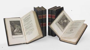 Édition originale de la traduction procurée par P. L. Lebas de ce roman gothique anglais. # Cinq frontispices, dont deux gravés par Mariage d'après Challiou, ornent les volumes ; ils se trouvent ici en épreuves avant la lettre. # Aucun exemplaire de cette édition n'est référencé au Catalogue collectif de France ou à la BnF. # Quelque peu oubliée aujourd'hui, Regina Maria Roche (1764-1845) était en son temps un auteur de romans gothiques à succès. Son troisième roman en particulier, Les Enfants de l'abbaye, était alors aussi populaire que les Mystères d'Udolphe d'Ann Radcliffe. La Visite nocturne est un de ses romans les moins connus. C'est « un extraordinaire récit de suspense qui ne trouve son étrange dénouement qu'à la fin [du dernier tome] », écrit Gérard Oberlé à propos d'une autre traduction du roman, publiée par Jean-Baptiste Breton la même année, à Paris, en six volumes in-16. # Exemplaire en belle condition dans son premier cartonnage – identique à celui du roman d'Élisabeth Guénard que nous présentons dans ce catalogue sous le n°77. # De toute rareté. # Menus frottements sur les coiffes, les coins et une pièce de titre. # Quérard, VIII, 91 – Oberlé, cat. De Horace Walpole... à Jean Ray, 1972, n°40 (autre éd.).