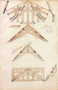 Important recueil manuscrit contenant de nombreux dessins de charpentes exécutés à la plume, certains coloriés à l'aquarelle. # Reliure très usagée, manque le dos et une partie du papier couvrant les plats, quelques déchirures et menus défauts d'usage aux dessins.