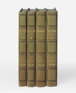 Édition originale. # Très recherché, ce fameux récit de voyage contient un réquisitoire contre le despotisme des tsars qui le rendit célèbre et passionna l'Europe de l'époque. Le quatrième tome renferme une planche généalogique dépliante. # Exemplaire en reliure de l'époque. # Dos uniformément passés, habituelles rousseurs.