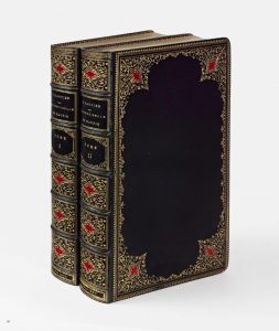 dentelle de rinceaux dorés comprenant quatre fleurons de maroquin rouge mosaïqués aux écoinçons, dos orné de même, filet sur les coupes, dentelle intérieure dorée, tranches dorées (P. Delacour).