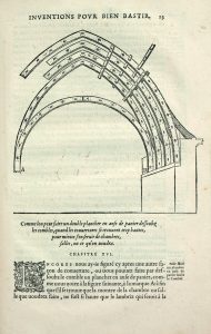 Yves Pauwels Architectura : » De l’Orme traite ici de l’utili- sation du bois, sans pour autant rédiger un livre de charpenterie. Son propos est à la fois plus limité et plus original : il s’agit de présenter une technique nouvelle consistant à remplacer poutres et solives par des assemblages de petites pièces de bois réunies dans des structures portantes, toitures ou planchers, à la manière des pierres dans une voûte. Cette invention, dont Philibert revendique avec fierté la paternité, présente selon lui tous les avantages : pallier la rareté des grands arbres, dégager les combles en éliminant tous les éléments traditionnels qui occupent l’espace dans les char- pentes habituelles, faciliter l’entretien car il est plus aisé et moins coûteux de remplacer un petit élément défaillant que de refaire toute une toiture, ce qui accroît la longévité de l’édifice. En outre, ce système d’assemblage fondé sur l’addition de pièces standardisées permet selon l’auteur de cou- vrir des portées inimaginables avec les procédés ordinaires limités par la taille des poutres. Ainsi De l’Orme évoque- t-il la possibilité de jeter de grands ponts d’une seule arche longue de près de 400 mètres ».
