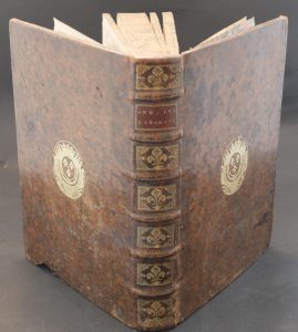1 volume In-Folio - Titre gravé, 1 portrait gravé hors texte (petit manque de papier au coin supérieur), bandeaux, texte encadré de noir sur 2 colonnes - Reliure de l’époque veau brun marbré orné des armes de Louis Auguste de Bourbon, duc du Maine (3 taches brune au 1er plat, 1 partie de coupe usée, 2nd plat rayé et accident en sa partie inférieure avec minime perte de cuir et de carton, mors partiellement frottés, certains coins usés) - Dos à nerfs orné de fleurs de lys (quelques discrets trous de ver) - Pièce de titre maroquin bordeaux - Tranches marbrées - Annotations anciennes à la 1ère garde (celle-ci salie) - Derniers feuillets légèrement salis en marge - Ex-libris armorié et cachets répétés de la bibliothèque du château des Guerrots - Olivier - Hermal - Roton - Manuel de l’amateur de reliures armoriées françaises, planche 2603, fer n°6.