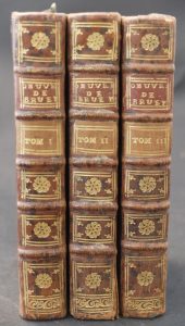 3 volumes In-12° - Portrait frontispice au tome I - Reliure de l’époque veau fauve marbré (fente de 2,50 cm au mors du 1er plat et petit manque de cuir au mors du 2nd plat du tome II, coins légèrement frottés) - Dos à nerfs joliment orné (1 petit accroc en coiffe supérieure du tome III) - tranches marbrées - Bel ensemble.
