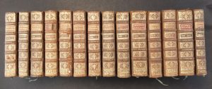 13 tomes en 14 volumes In-12° - Portrait frontispice (détaché), 3 planches, 1 plan, et 2 cartes dépliants - Reliure de l’époque veau brun (quelques plats rayés ou frottés, 1 épidermé, de rares et superficiels travaux de ver, 2 petits manques de cuir, quelques coins frottés, 3 coiffes accidentées - Dos à nerfs ornés - Pièces de titre et de tomaison maroquin fauve (hormis pour le tome VII, bordeaux en partie détachée) - Au tome V : galerie de ver en marge inférieure des 25 derniers feuillets, au tome VII, galerie de ver en marge sur la quasi-totalité puis plus prononcée, affectant le texte en partie au 45 derniers feuillets, au tome XI, seconde partie, galerie de ver en marge sur l’ensemble, au tome XIII, petite galerie de ver en marge - Tranches rouges mouchetées.
