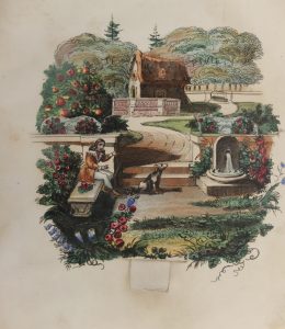 1 volume In-12° - Faux titre, titre, titre répété avec figure mobile (manquante), 2 pages (table), VII, 1 page non chiffrée (mention de l’astérisque figurant dans le texte et mentionnant aux enfants quand actionner les tirettes), 157 pages et 13 pages à système (dont titre) aquarellées à la main - 1ère : système manquant, 2nde : complète, 3ème : complète, 4ème : complète, 5ème : complète, 6ème : 1 tirette manquante sur les 2 et 1 déchirure sans perte, 7ème : tirette manquante, 8ème : complète, 9ème : complète, 10ème : complète malgré plusieurs déchirures et une petite perte en bas de la tirette, 11ème : complète, 12ème : en grande partie manquante, 13ème : complète, déchirée et partie externe des contours déchirés et écornés - Pages salies, parfois piquées, quelque peu écornées - Reliure demi-basane cerise, cartonnage éditeur (sali) vert d’eau gravé et titré aux 2 plats (coins usés, parties de coupes frottées avec petits manques de papier ayant entrainé un décollement partiel du papier du 2nd plat) - Dos lisse orné de filets et titré or - Ancienne étiquette de librairie au verso du 1er plat - Rarissime 1ère édition de ce livre pour enfants considéré comme l’un des 1ers livre interactif.