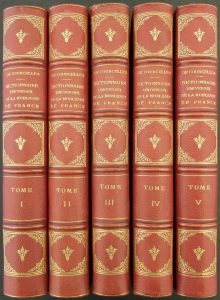 5 volumes In-8° - Reliure postérieure (fin XIXème siècle) demi-chagrin cerise - Dos à nerfs ornés, titrés et tomés or - 5 planches d’armoiries et 1 planche gravée - Ex-libris armorié répété « Pol en vaillance est lion - In sudore sanguinis » ainsi que cachets répétés de la bibliothèque du château des Guerrots - Bon exemplaire non rogné.