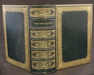 1 fort volume petit In-12 - Texte encadré de rouge - Frontispice et nombreuses illustrations or et couleurs en chromolithographies montés sur onglets d’après les manuscrits de tous les siècles par Kellerhoven - Belle reliure de l’époque maroquin bleu nuit (signée Lesort) - Large dentelle et filets dorés aux plats - Dos à nerfs orné et titré or - Large dentelle à l’intérieur des plats - Gardes moirées bordeaux (la 1ère au monogramme doré L A) - Très bel exemplaire sous coffret.