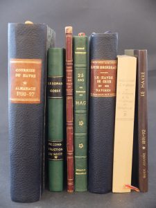 soit 7 numéros [sur 12] reliés en 1 volume In-8° - Couvertures conservées (parfois salies), illustrations in et hors texte en noir - Reliure amateur postérieure (1 cahier rehaussé quasi-détaché) demi-skyvertex marine (1 petite fente au 1er mors) - Dos lisse - Pièce de titre chagrin havane - ESDRAS-GOSSE (B.) - Alors, les Havrais rebâtirent leur ville… - Histoire d’une reconstruction - Tome I (seul) - Sans lieu [Le Havre] ; Entr’Aide du Havre, sans date [1951], 1 volume In-12° - Dessins hors texte de Mélissent - Ex-dono manuscrit à l’encre sur garde - Reliure amateur postérieure demi-skyvertex vert - Pièces de titre et de tomaison chagrin noir - Edition originale numérotée - Le Havre de Grâce et ses navires - Catalogue illustré […] - Le Havre ; Imprimerie du petit Journal Le Petit Havre, 1927 - 1 volume In-8° - Nombreux hors texte en noir - Reliure amateur postérieure demi-skyvertex marine - Dos lisse - Pièce de titre chagrin brun - Couvertures conservées - Bon exemplaire - Guide Joanne Le Havre - Paris ; Hachette & Cie, sans date - 1 volume In-12° - Illustrations in et hors texte en noir et 1 carte dépliante - Reliure amateur postérieure demi-skyvertex brun - Dos lisse titré or - Couvertures conservées - COCHET (Abbé) - Essai historique et descriptif sur l’abbaye de Graville - Le Havre ; J. Morlent, 1840 - 1 volume In-12° - Frontispice, titre gravé, Quelques rousseurs - Ex-libris R. Chardet - Reliure demi-chagrin bordeaux de l’époque - Dos à nerfs orné et titré or - VASSENET (André) - 25 ans au service du Havre Athelic Club - Le Havre ; Rolland, 1948 - 1 volume In-12° - In et hors texte en noir - Reliure demi-basane verte - Dos à nerfs titré or - On y joint : LE NOVICE DU PRIEURE (Jérôme) - L’abbaye et le château de Graville - Tome II - Le Havre ; Costey, sans date - 1 volume In-12° débroché - Bon état de l’ensemble.