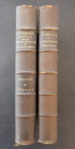 1 volume In-8° - Reliure de l’époque demi-chagrin brun (mors frottés) - Dos à nerfs (1 accroc en coiffe inférieure) titré et daté or - Ex-dono manuscrit à l’encre à la 1ère garde, nom de l’ancien propriétaire sur la 2nde - Couvertures conservées - Quelques rousseurs éparses - Des passages soulignés au crayon bleu dans la longueur en marge - Edition originale - On y joint : Du même - Essai sur les données immédiates de la conscience - 5ème édition - Paris ; Félix Alcan, 1906 - Etat similaire.