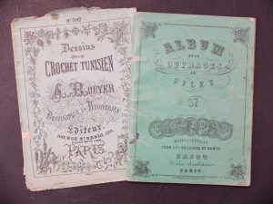 1 plaquette In-16° - 13 figures hors texte - Dessins pour crochet tunisien n°302 - Paris ; Rouyer - 1 plaquette en accordéon - 7 planches couleurs (contours effrités avec petits manques en marge).