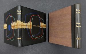 1 volume minuscule oblong (9x9,50 cm) - Gravure sur celluloïd en 4 états (noir, vert, bleu et rouge), les 4 signés de la main de Joan Miro - Reliure veau noir signée et datée (1992) de Leroux ornée d’une fine bande de peau de reptile la traversant en sa longueur ainsi que de 3 motifs géométriques vert, rouge et bleu encadrant le titre doré au 1er plat et une incision de cuir bleu au second - Auteur et artiste en lettre dorées sur le dos lisse - Gardes de daim kaki - Tête dorée - Coffret de bois au dos à l’identique et emboîtage bois - Très bel exemplaire en édition originale hors commerce sur papier vergé fin d’Auvergne à la main Richard-de-Bas (IV sur les VI hors commerce) justifié au crayon par l’éditeur (tirage total : 46 exemplaires) - Cat. PAB, 315 - Bibliographie des œuvres de René Char, n° 85 - Cramer, Miró, n° 47. Provenance : Jean PARIZEL, collectionneur d’ouvrages futuristes et ami de P. A. B.
