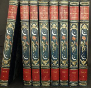 8 volumes grand In-4° - Frontispices et très nombreuses illustrations en couleurs par fac-similé de miniatures, encadrements et enluminures qui ornent les manuscrits originaux persans et hindous - Large encadrement du texte par des motifs orientaux en plusieurs coloris - Reliure éditeur demi-veau marine glacé (1 accroc au 2nd plat du tome III, coupes et coins légèrement frottés) - Jolis dos à nerfs ornés de motifs orientaux argent, rouge et or (quelques frottements) - Pièces de titre et de tomaison maroquin cerise - Têtes dorées - Bon exemplaire, bel intérieur.