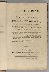 [SAINT-MARTIN (Louis-Claude de)]. Le Crocodile, ou la Guerre du bien et du mal, arrivée sous le règne de Louis XV ; poème épiquo-magique en 102 chants [...]. Œuvre posthume d'un amateur de choses cachées. Paris, De l'Imprimerie-Librairie du...