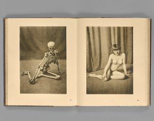 Édition originale de cette Danse macabre anatomique, illustrée de 50 planches artistiques dont 25 photographies d'hommes et de femmes nus et 25 autres de squelettes dans des positions identiques.