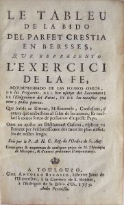 Toulouzo, Antoino Birosso, 1759. In-8, reliure de l'époque basane marbrée, dos à 5 nerfs orné. Restauration ancienne sur les plats, qq. épider-mures, coins usés. xxxx-360-24 pp. Le tableau de la vie du parfait chrétien, en vers, qui représente l'exercice de la fol, paru pour la première fols en 1673, contient in fine un glossaire gascon-français et des airs notés.