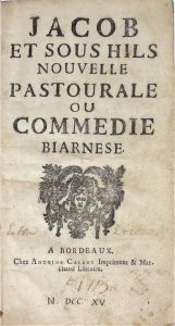 Anonyme. Jacob et sous Hils. Nouvelle Pastourale ou Commedie Biarnese. Bordeaux, An-toine Calamy, s. d. (1715). In-8, broché. Couverture d'attente faite d'un vieux parchemin. 30 pp. Rare plaquette en occitan mettant en scène Jacob et ses fils :...