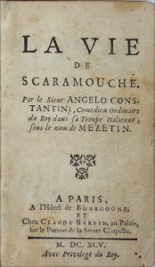 Constantini (Angelo). La Vie de Scaramouche. Par le Sieur Angelo Constantini, Comedien Ordinaire du Roy dans sa Troupe italienne, sous le nom de Mezetin. Paris, Hôtel de Bourgogne et Claude Barbin, 1695. Petit in-8, reliure de l'époque veau brun,...