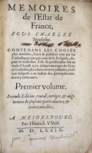 [Goulart (Simon)]. Memoires de l'Es-tat de France, sous Charles Neufiesme. Contenans les choses plus notables, faites & pu-bliees tant par les Catholiques que par ceux de la Religion, depuis le troisiesme Edit de pacification fait au mois d'aoust...
