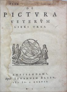 Junius (Franciscus ou François du Jon en français). De Pictura Veterum. Libri tres. Amstelædami (Amsterdam), apud Iohannem Blaeu, 1637. In-4, reliure de l’époque veau brun, dos à 5 nerfs orné, double filet doré en encadrement sur les plats....