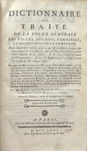 La Poix de Freminville (Edmé de). Dictionnaire ou Traité de la Police Générale des villes, bourgs, paroisses, et seigneuries de la Campagne... Ouvrage nécessaire à tous les Officiers de Police et de Justice... Nouvelle édition, revue &...