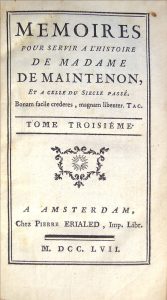 [Maintenon]. La Beaumelle (Laurent Angliviel de). Mémoires pour servir à l’Histoire de Madame de Maintenon, et à celle du Siècle passé. Amsterdam, Pierre Erialed, 1757. 6 tomes en 3 volumes in-12, reliure de l'époque veau marbré, dos à 5...