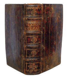 titre maro- quin brun, décor à la Duseuil sur les plats avec fleurons d'angle en pointillé, roulette Intérieure en dents de rat, garde peignée, tranches rouges. Coiffes déchirées sur le T. 5, arasée en tête sur le t. 2, coins plus ou moins usés, qq. épider- mures. Belle marque de l'imprimeur sur les pages de titre, devise en fin de volume. Trace de mouillure sur les deux volumes. Bon état intérieur. Édition estimée des œuvres de Platon par Jean de Tournes dans la traduction latine de Marsilio Ficino. Tomes 2 et 5 seuls. Brunet IV, 698.