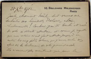 coins usés. Chants du Soldat; Nouveaux Chants du Soldat; Marches et Sonneries; Refrains Militaires (1 f. déchiré sur 5 cm); Chants du Paysan. Papier parfois un peu bruni. Envoi admiratif de Paul Déroulède à Marie Mariquita sur chaque volume. Ensemble accompagné d'une carte de Déroulède, du 31 déc. 1912 : Quel charmant Noël sont venues me souhaiter vos hirondelles Chère Mademoiselle. Combien j'ai été touché .et comme je regrette que mon relieur m'ait fait at- tendre jusque à ce matin les cinq petits volumes que j'aurais voulu vous offrir . Marie Mariquita (Alger, 1841 - 1922) fut engagée comme maîtresse de ballet à l'Opéra Comique en 1898 où elle demeura jusqu'en 1920. Joint : carte postale avec portrait de Déroulède par Cormon.