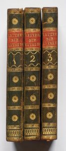 Dupaty (Charles). Lettres sur l’Italie, écrites en 1785. Nouvelle édition, écrite avec soin, ornée de Figures. Avignon, Joly, 1811. 3 volumes in-12, reliure de l'époque demi-veau vert, dos lisse. Qq. légers frottements sur les mors, petit...