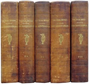Hugo (Victor). Les Misérables. Paris, Pagnerre, 1862. 5 volumes in-8, reliure demi-basane, dos lisse orné de roulettes de fleurs poussées à froid et d'un fer doré à l'urne surmontée d'un oiseau. Dos légèrement insolés, qq. légères...