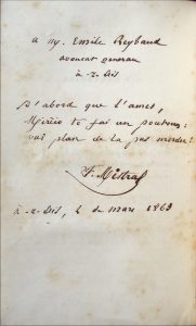basane noire. Petits frottements, coins légèrement émoussés. viii-51 1 pp. Rousseurs. Première édition in-12, l'originale est parue au format in-8 chez Roumanille, l'année précédente. Bel envoi de Mis-tral à l'avocat aixois Emile Reybaud. Vicaire V, 902.