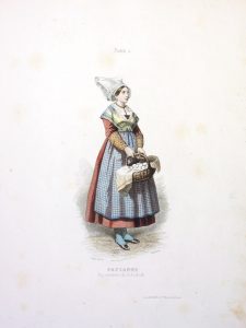 Bureau des Modes Parisiennes, 1854. In-4, reliure demi-chagrin noir, dos à 5 nerfs. Nerfs et mors frottés, petites épidermures, coins émoussés. Couverture conservée imprimée en doré (taches, gribouillages). Album de 20 planches finement rehaussées en couleurs repré- sentant des personnages d'Algérie, Allemagne, Sardaigne, La Rochelle, Nîmes... Suivi de 20 planches rehaussées en couleurs de l'album des costumes de personnages à la Cour des Rois de France gravées par A.Portier, G. Montaut d'Oleron ou Monnin. Illustration de mode découpée et collée sur une page de garde, rousseurs ou traces plus ou moins marquées. Recueil composé de deux albums complets, soit 40 planches gravées sur acier et coloriées, d'après les dessins de Compte Calix.
