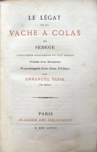 Vasse (Emmanuel). Le Légat de la Vache à Colas par de Sedege. Complainte huguenote du xvie siècle. Précédée d’une intro-duction . par E. Vasse. Paris, Willem, 1868. In-12, reliure moderne demi-basane verte, dos lisse, titre doré au dos....