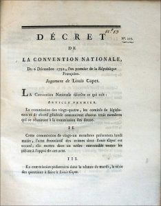1791 (60 pp.). 2. Loi. Code pénal. Don-née à Paris, le 6 octobre 1791 . (48 pp.). 3. Dé- crets de la Convention Nationale des 21 , 23, 24 et 25 février 1793 (40 pp.). 5. Loi qui détermine le mode de constater l'état civil des Citoyens. Du 20 septembre 1792 (20 pp.). 6. Loi relative à l'organisation de la Garde Nationale Donnée à Paris, le 14 octobre 1791 (28 pp.). 9. Décret de la Convention Nationale du 24e jour du 1er mois de l'an second. concer- nant des Mesures pour l'extinction de la Mendicité (16 pp.). 12. Décrets de la Convention Nationale des 9.15 Décembre 1792 . relatifs au Procès et Jugement de Louis Capet (16 pp.). 13. Décret de la Conven- tion Nationale du 6 Décembre 1792. Jugement de Louis Capet (3 pp.). 14. Décret de la Convention Nationale des 15, 17, 19 & 20 Janvier 1793 . Relatif à Louis Capet, dernier Roi des Français. Paris, de l'imprime- rie nationale exécutive du Louvre. 1793 (3 pp.). 15. Loi relative au res- pect dû aux juges & à leurs jugements. Donnée à Paris, le 17 Avril 1791 . Bordeaux, Michel Racle, 1791 (6 pp.). 17. Décret de la Convention Na- tionale du 18e jour de Frimaire, an second . relatif à la liberté des Cultes (3 pp.). 22. Rapports de la commission des Finances et Lois sur la Dette publique. Paris, Imprimerie Nationale, 1793 (49 pp.). 30. Décret de la Convention Nationale du 4e jour de Frimaire, an second . sur l'Ere, le commencement & l'organisation de l'Année, & sur les noms des Jours et des Mois (54 pp. et un tableau dépliant : Concordance des calendriers). Recueil in-4 sommairement broché. Petits trous de vers sur les deux der- niers fascicules touchant qq. lettres. La majorité des lois et décrets sont publiés chez Leclerc à Mont-de-Marsan. On note la présence des fasci- cules numérotés 13 et 14 sur le jugement de Louis XVI.