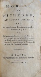 Moreau Moreau et Pichegru, au 18 Fruc-tidor an 5, suivi de la conjuration de ce dernier, pen-dant les années 3, 4 et 5; et de la correspondance des nommés Drake et Spencer-Smith. Paris, imprime-rie de Bertrand-Pottier, Germinal An Xii (1804)....