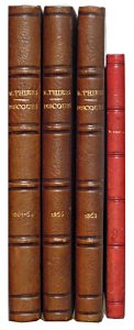 marchande et les finances de la France. 1 864. • Discours sur les Principes de 1 789, l'État de l'agriculture en France, la Marine marchande et la Politique extérieure. Session de 1 866. • Discours sur la Liberté de la Presse. 1 868. Sur les Affaires d'Alle-magne et d'Italie. 1 867. 3 volumes in-8, reliure identique demi-chagrin brun, dos à 4 faux-nerfs soulignés de filets à froid. Rares rousseurs. Bon état général. • Discours sur la Question Romaine et la Politique extérieure. 1868. In-12, reliure demi-rouge, dos lisse orné de nerfs simulés à froid.