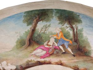 éventail. Fin xviiie. Feuille d’éventail, 28 x 54 cm, à décor de scène galante, gouache et aquarelle. Déchirures marginales.