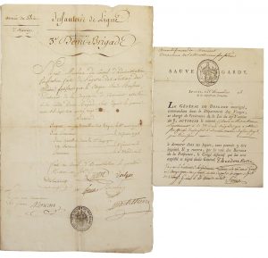 Militaria. Réunion de deux documents : • Etat de Service. Armée du Rhin, 1er Nivôse an 8 (1798). 1 p. in-4. Pliures restaurées au verso. Manuscrit donnant les grades du ci- toyen Rousseau (Infanterie de ligne, 3e demi-brigade). Signé...