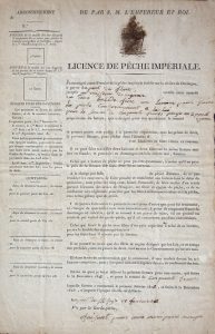 Pêche. Licence de Pêche Impériale. Sainte Foy, 1816. Document (37,5 x 24,5 cm) imprimé et complété. Aigle impérial en tête caviardé. Licence délivrée à partir du port du Fleix pour l'année 1816 et signée par la femme du garde-pêche :...