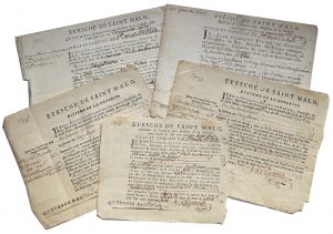 Taxes. Réunion de cinq quittances. Saint Malo, xviiie s. Réunion de cinq documents imprimés et complétés : Deux quittances pour le Dixième de la Noblesse (1735, 1737) et trois quittances de Ca- pitation (1742, 1748, 1751), toutes signées de...