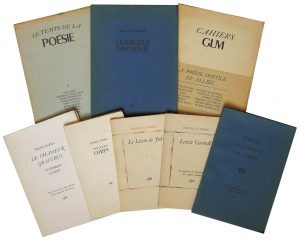 celui-ci, un des 1250 ex. sur vélin. Ouvrage bilingue. • CHEDID (Andrée). Prendre Corps. GLM, 1973. In-12, broché. Couverture légèrement défraîchie. 47-(2) pp. Tiré à 665 ex. numérotés dont celui-ci, un des 650 ex. sur offset. • COLLECTIF. Le Temps de la Poésie 2. Quatre dessins inédits de Federico Garcia Lorca. Paris, GLM, décembre 1948. In-8, broché. Marges un peu insolées et petites déchirures en tête. 54 pp. Tiré à 1080 ex. numérotés dont celui-ci, un des 1050 ex. sur Alfama. • COLLECTIF. Cahiers GLM. Automne 1956. Quatre dessins inédits de Giacometti. Paris, GLM, 1956. In-8, broché, bandeau conservé. Couverture un peu piquée. 77-(1) pp. Quatrième cahier de la nouvelle série, celui-ci non justifié. Qq. rousseurs. • [MANO]. Coplas de la Peine et de l'Amour. Texte espagnol et traduction de Guy Lévis Mano. Paris, GLM, 1958. In-8, broché. Couverture légèrement défraîchie. 47-(2) pp. Tiré à 1150 ex. numérotés dont celui-ci, un des 1 125 ex. sur vélin. Ouvrage bilingue. • KAFKA (Franz). Le Chasseur Gracchus. Un hybride. Le pont. Texte français par Parisot. Deux images de Max Ernst. GLM, 1970. In-12, broché. Qq. piqûres en couverture. 35-(2) pp. Tiré à 1307 ex. numérotés dont celui-ci, un des 1292 ex. sur offset. Non coupé. • PRÉVERT ( Jacques). Lumières d'Homme. Paris, GLM, 1955. In-8, broché. Couv. légèrement insolée. 43-(3) pp. Petite tache sur un f. Édition originale tirée à 1565 ex. dont celui-ci, un des 1520 ex. sur vélin. • Le Livre de Job. Adaptation par Henri Stierlin. GLM, 1950. In-12, br. 36 pp. Tiré à 1300 ex. dont celui-ci, un des 1250 ex. sur vélin.