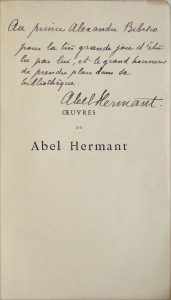 Littérature. Réunion de deux ouvrages dédicacés : • Hermant (Abel). Œuvres. Paris, Lemerre, 1906. In-1 2, broché. Petites déchirures en couverture. Portrait en frontispice. Envoi de l'auteur au prince Bibesco sur le faux-titre. •...