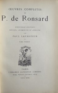 Ronsard (Pierre de). Œuvres Complètes. révisée, aug-mentée et annotée par Paul Laumonier. Paris, Lemerre, 1914-1919. 8 volumes in-8, reliure demi-basane marbrée, dos à 3 faux-nerfs orné, tête dorée. Qq. légers frottements. Couvertures...