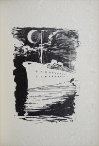 dorée. Belle couverture bleue à motif d'une lune argentée et d'étoiles dorées. 65-(6) pp. Illustrations dans le texte et à pleine page. Envoi de l'auteur sur le faux-titre. Feuillet de souscription joint. Édition originale tirée à 200 ex. hors commerce et 500 ex. numérotés sur BFK de Rives dont celui-ci, accompagné d'une lettre de l'auteur s'excusant du retard pour l'envoi de l'ouvrage.