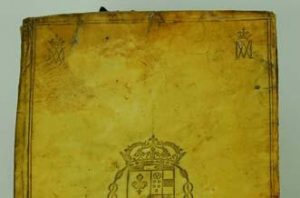 qui en sont descendus depuis Gaston de Moncade jusqu’au Roy Louis XIII, contre un livre intitulé Le Moine, tenant à assujettir la principauté de Béarn au royaume d’Aragon, avec les preuve - Paris,1616 - in-4 : 91p. dont le titre - Vélin ancien, plats aux armes, monogramme dans les angles, dos lisse à fleurs de lys. Exemplaire réglé signatures []1, A-L4, M1 Aux armes de MARIE DE MÉDICIS, reine de France, 2ème épouse de Henri IV, mère de Louis XIII O.H.R. 2504 fers n°2 et 4 Exemplaire ré-emboîté, gardes renouvelées. Le 1 er f. bl. le dernier f. (p.91) et une garde ancienne doublés laissent apparaître en transparence des annotations anciennes. petit manque de papier en angle du titre, mouillures, papier parfois jauni, petites taches éparses, manque de vélin en coiffe de tête, traces de liens, bords du vélin un peu roussi) Brunet III, 1011 "Ce livre, qu’on ne trouve plus facilement, est une réponse à un écrit plus rare encore qui a pour titre : Le Moine au surveillant endormi... Avignon, Eusèbe de Carpentras, 1616"