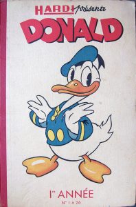 Donald. Hardi présente Donald. 1ère Année, n° 1 à 26. 23 Mars - 14 Septembre 1947. Album in-folio, cartonnage éditeur dos rouge, plats illustrés. Petite déchirure à la coiffe inférieure, quelques pliures. Bel état général. Hebdomadaire...
