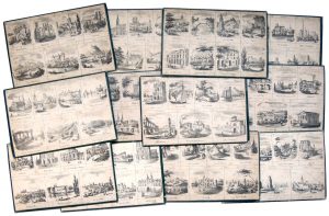 [Jeu]. Loto. Jeu de Loto. Seconde moitié xixe s. Jeu composé de 12 cartons (14 x 21 cm) contrecollés de lithogra- phies en noir composées de 7 cases illustrées des principaux monuments et vues de différentes villes de France. Traces d'usure,...