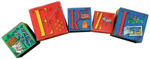 [Jeu]. Cubes. Jeu de cinq cubes. Vers 1940. Jeu de 5 cubes gigognes en carton, illustrés des lettres de l'alphabet et de dessins dont certains marqués par leur époque : portrait du maréchal Pétain, francisque, dirigeable. Marqué Aut. Vichy 0...