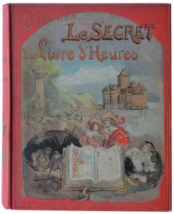[Robida]. Dodeman (Ch). Le Secret du Livre d’Heures. Illustrations d’après A. Robida. Tours, Mame, s. d. (1912). In-4, cartonnage éditeur percaline rouge, grand décor polychrome sur le plat supérieur, tranches dorées. Petite usure sur un...